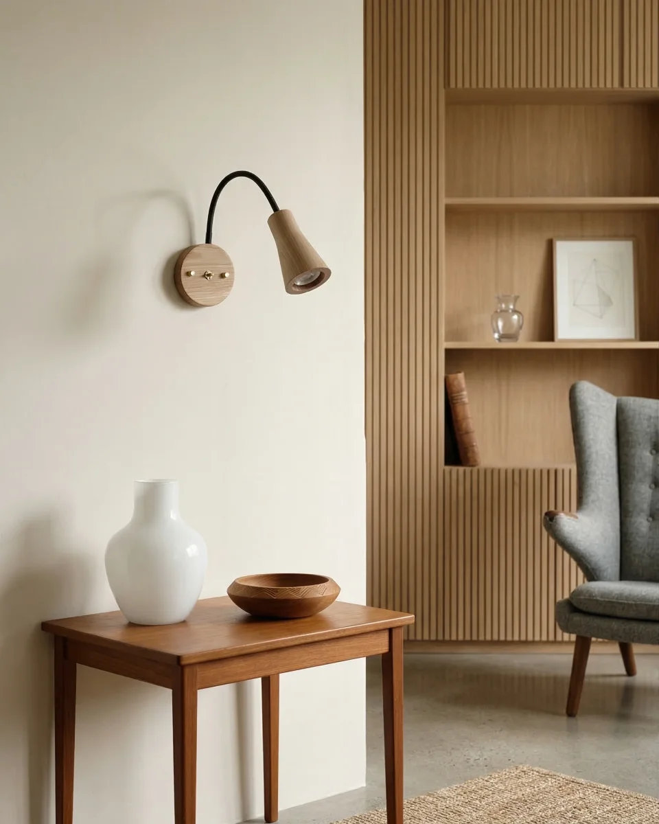 Le caractère exclusif de la collection FINA réside dans son dialogue chromatique et tactile. Le corps en noyer foncé, richement veiné, est ponctué d’accents en laiton doré brossé, apportant une touche de lumière métallique subtile. Le diffuseur en verre texturé, avec ses cannelures précises, capture et fragmente la lumière pour transformer chaque mur en une œuvre d’art dynamique, rappelant l’esthétique Modern-Rustique de haut vol.