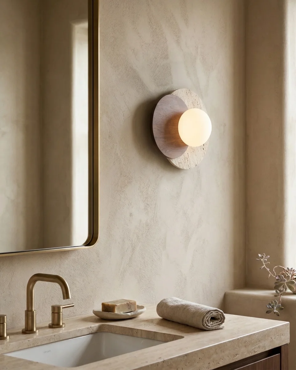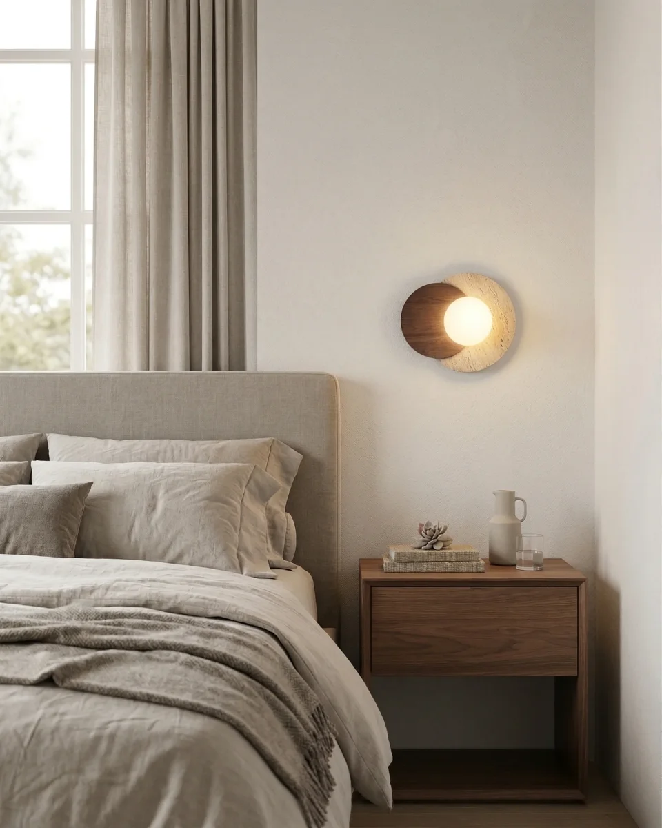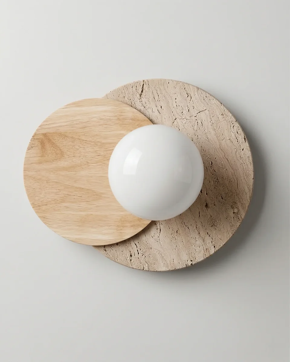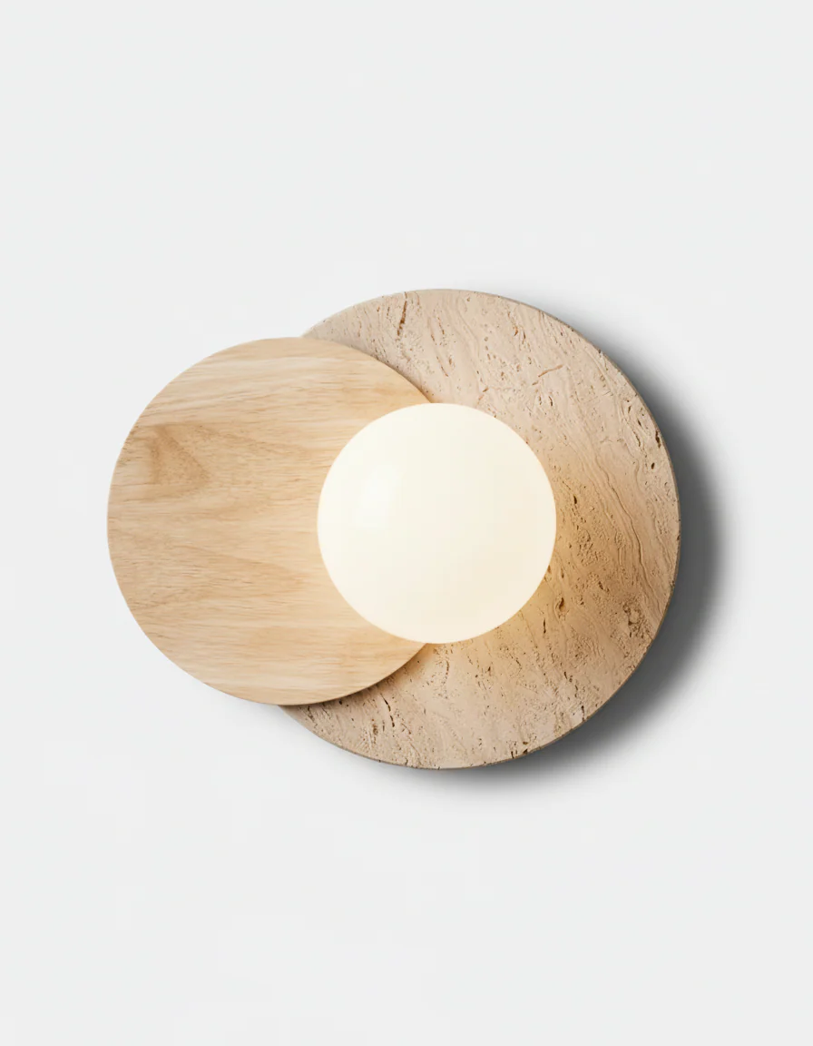 Applique Murale & Plafonnier MAKU : L’Équilibre Sculptural du Travertin Jaune et du Bois