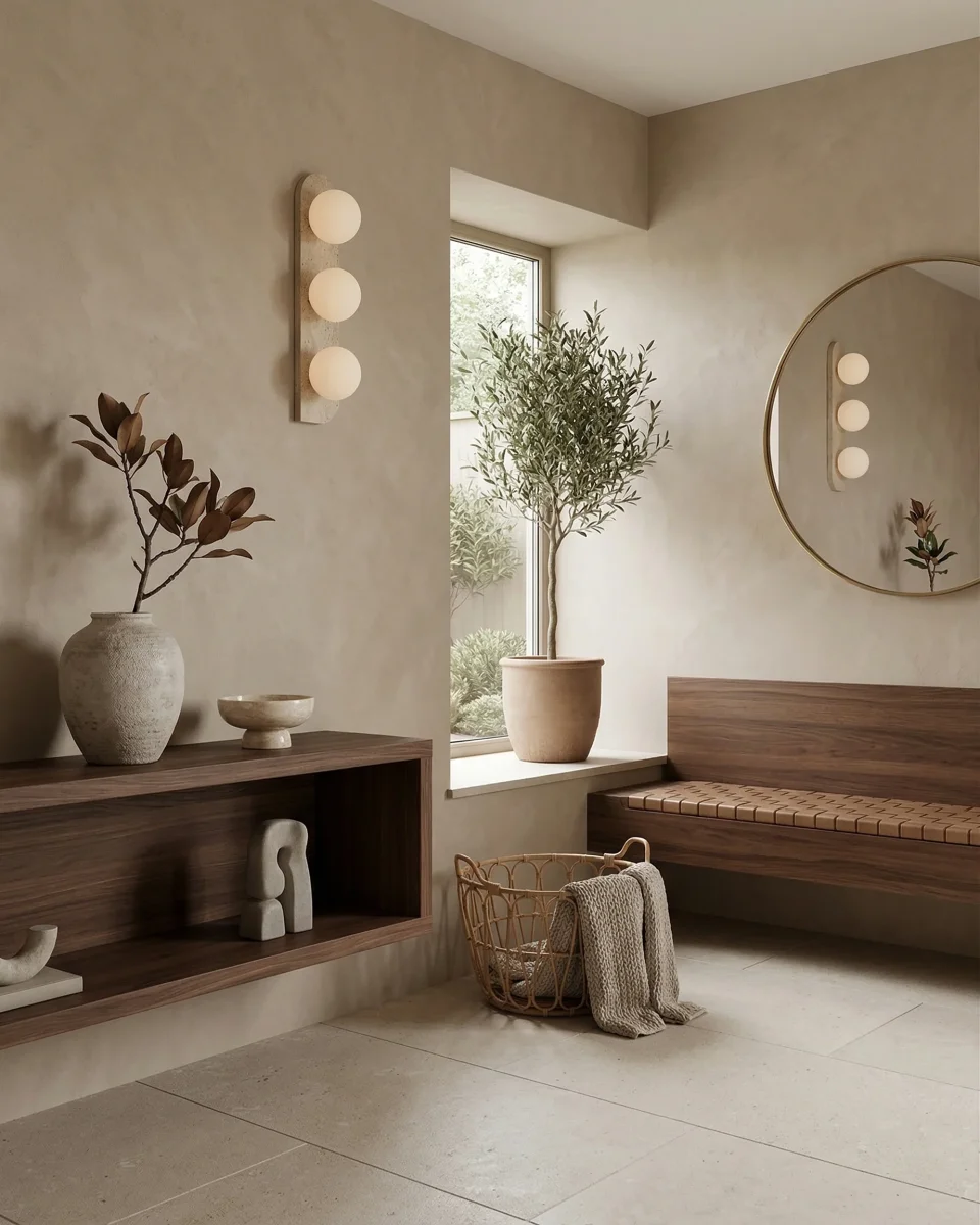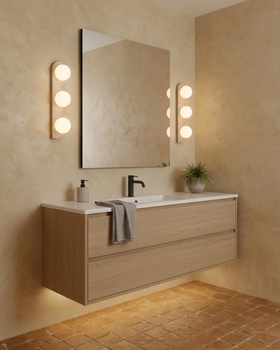 L’expérience lumineuse NEMI repose sur la valorisation des textures par la lumière rasant. Les globes en verre opalin premium diffusent un flux Blanc Chaud 3000K qui vient effleurer la porosité millénaire du travertin. Ce jeu d’ombres et de reflets souligne le grain unique de la pierre tout en garantissant un confort visuel absolu. Entièrement compatible avec les variateurs d’intensité, elle vous permet de sculpter l’aura de votre sanctuaire privé selon vos désirs.