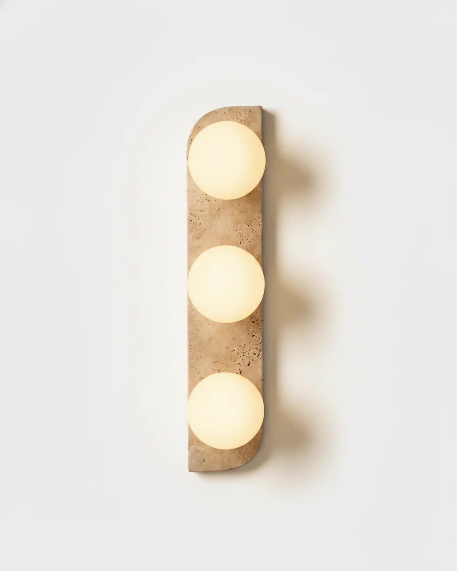 Applique Murale NEMI : L’Équilibre Sculptural du Travertin et des Globes d’Opale