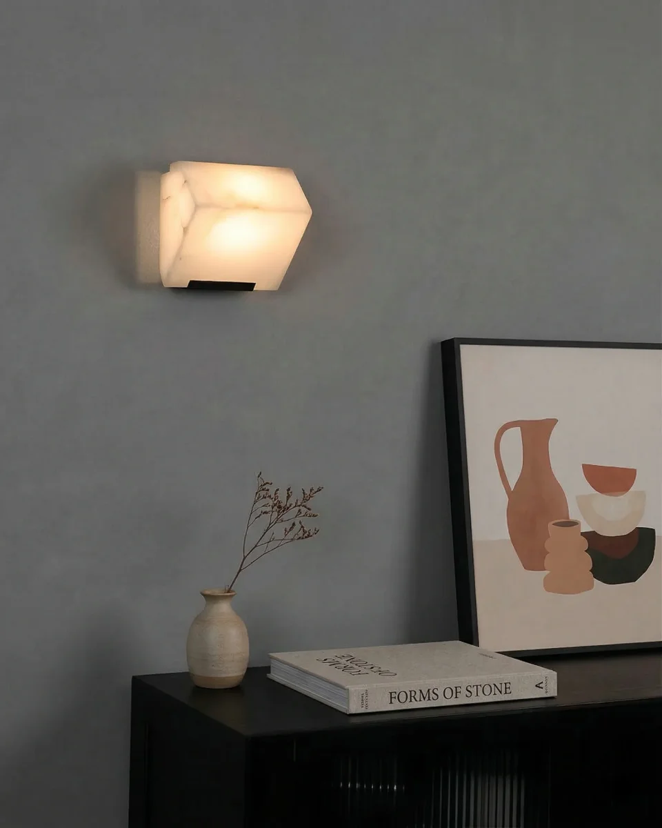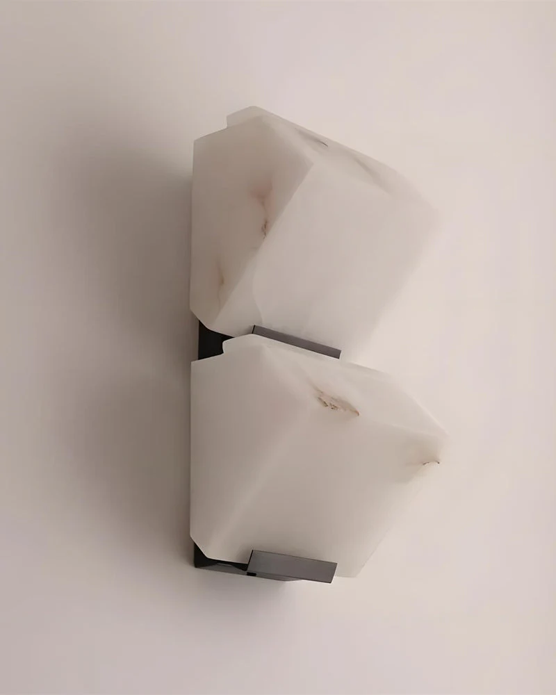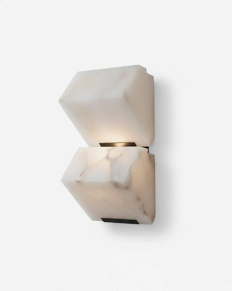 L’applique murale NORI redéfinit l’éclairage de prestige en plaçant la pierre au cœur de son design. Véritable sculpture d’avant-garde, elle est taillée dans des blocs d’Albâtre véritable aux facettes géométriques audacieuses, enserrés par une monture en laiton massif (Brass). Ce luminaire d’exception ne se contente pas d’éclairer ; il habite l’espace, transformant chaque paroi en une œuvre d’art minérale unique.