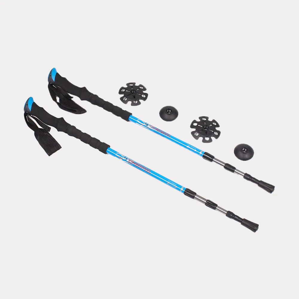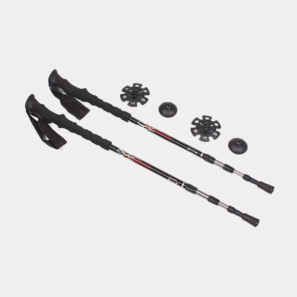 Amortisseur intégré, poignée en mousse confortable, livrés avec rondelles pour boue et neige, réglables de 65 à 135 cm, idéal pour randonnée sur tous terrains.