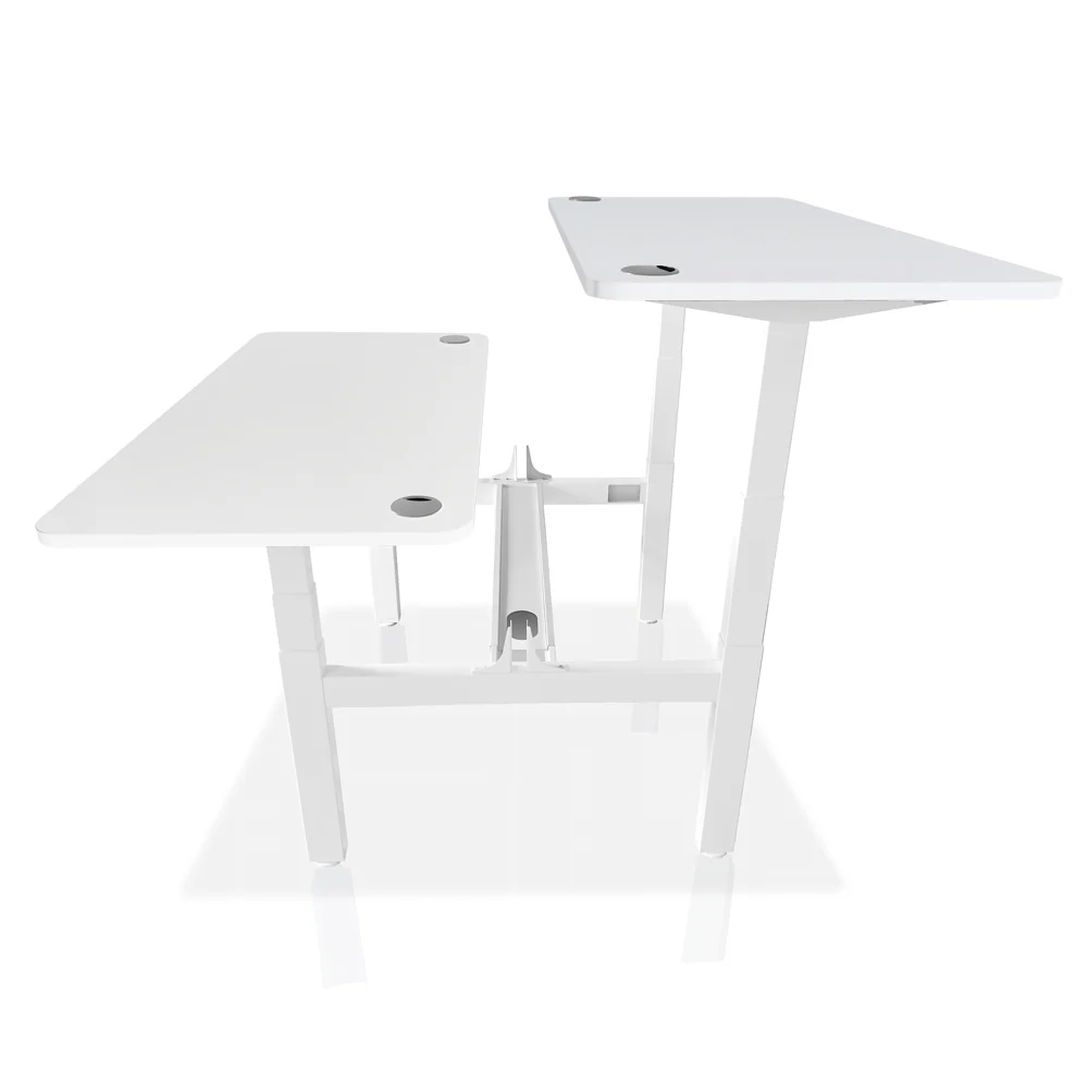 Bureau assis-debout KQUEO Duo 120×80 cm, double plateau, deux postes de travail individuels, format compact, 2 moteurs, goulotte passe-câble, et port USB intégrés.