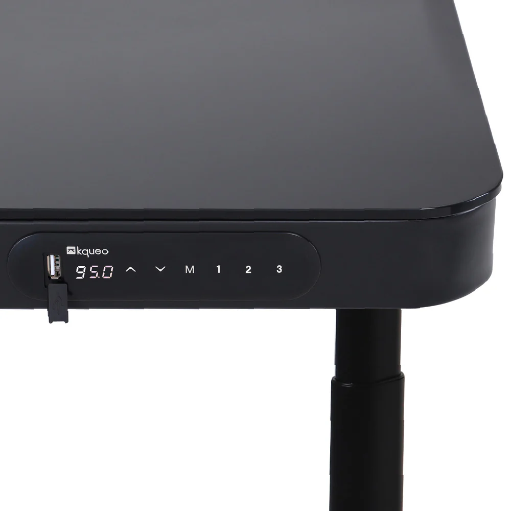 Bureau assis debout KQUEO Dynamic Circle Connect 140×70 cm, plateau verre trempé, piètement rond, deux moteurs, port USB, chargeur induction, hauteur réglable de 64,5 à 129,5 cm.