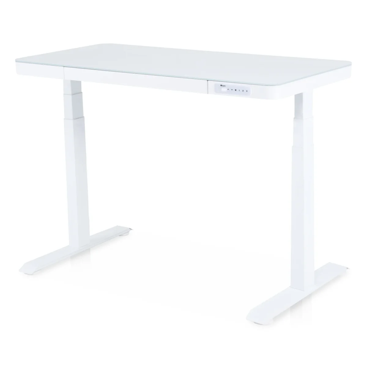 Bureau assis-debout KQUEO Dynamic Square Connect 140×70 cm, plateau verre trempé, piètement droit, motorisation double, port USB, induction, panneau digital, hauteur réglable 64,5–129,5 cm.