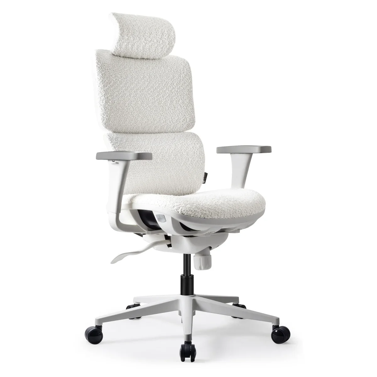 Chaise de bureau ergonomique KQUEO Terrana en tissu bouclette blanc, structure blanche, appuie-tête réglable, accoudoirs 3D, dossier ajustable, design cocooning.