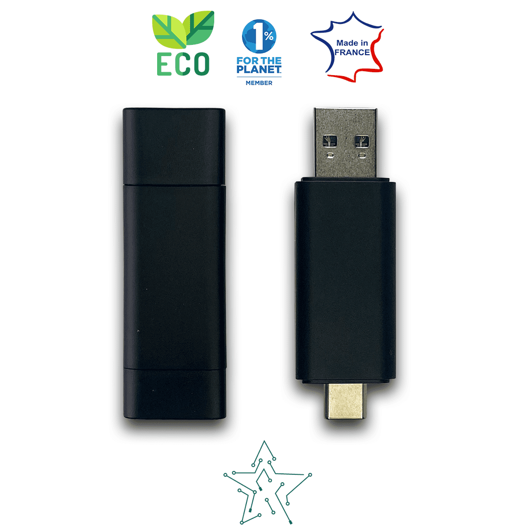 - Qualité Made In France et réduction de l’empreinte carbone : En tant que produit fabriqué en France, cette clé USB bénéficie des normes de qualité élevées associées à la fabrication dans ce pays. De plus, opter pour notre clé USB fabriquée localement réduit les distances de transport, contribuant ainsi à minimiser l’empreinte carbone associée à la distribution du produit.