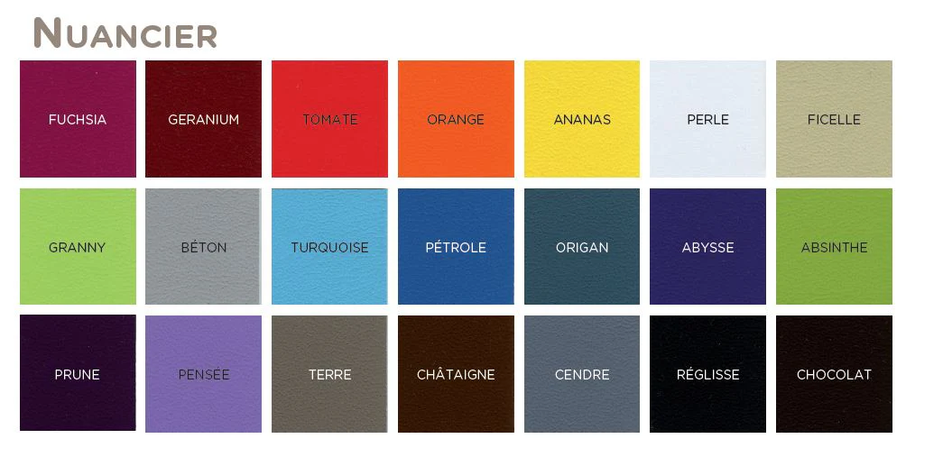 | Couleur | Absinthe, Abysse, Ananas, Béton, Cendre, Châtaigne, Ficelle, Fushia, Geranium, Granny, Noir, Orange, Origan, Pensée, Perle, Pétrole, Prune, Reglisse, Terre, Tomate, Turquoise |