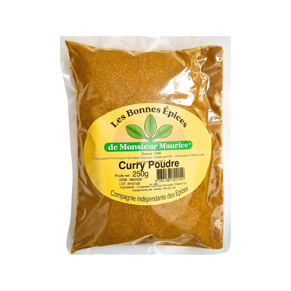 Le curry poudre Les Bonnes Épices de Monsieur Maurice 250g, directement importé de la Guadeloupe.