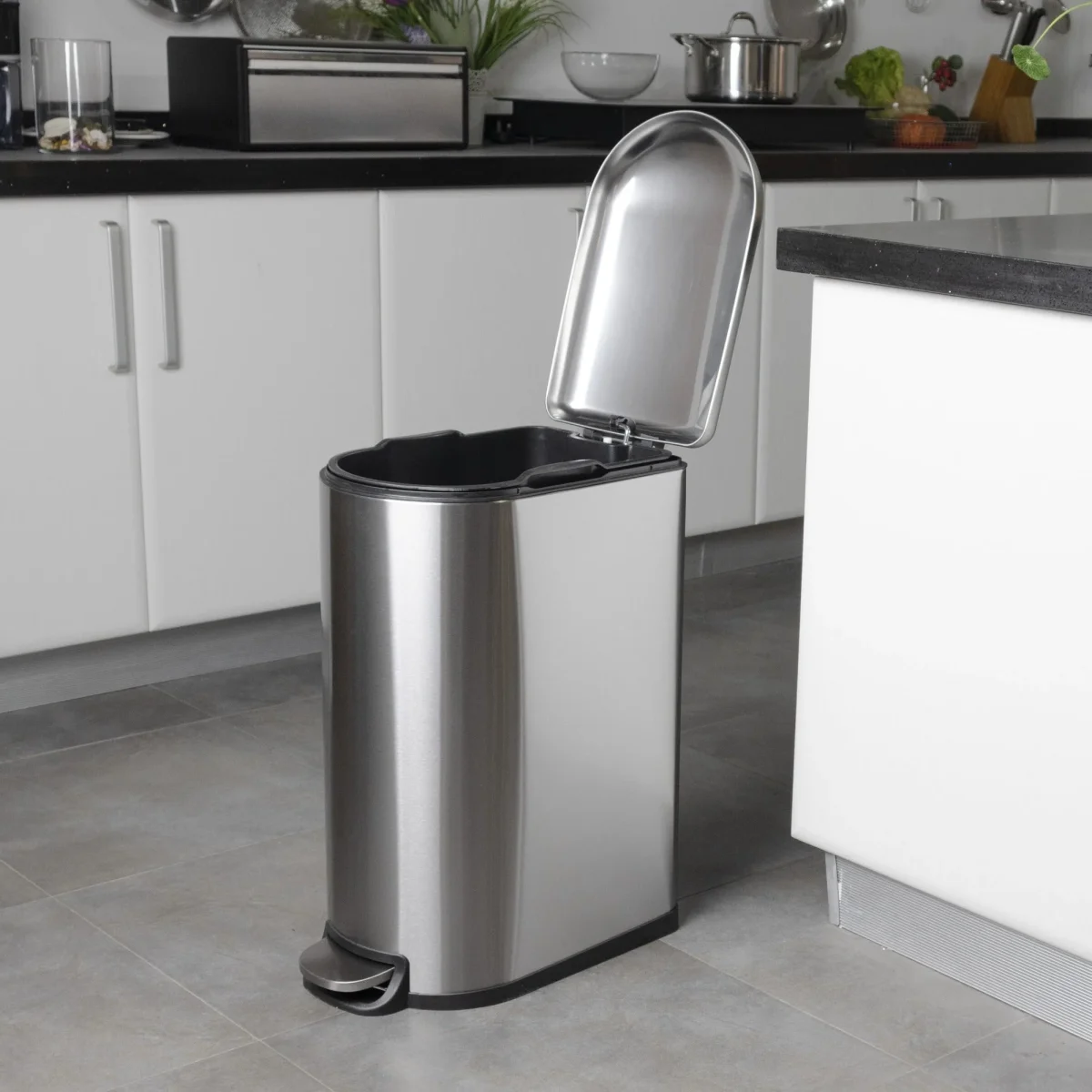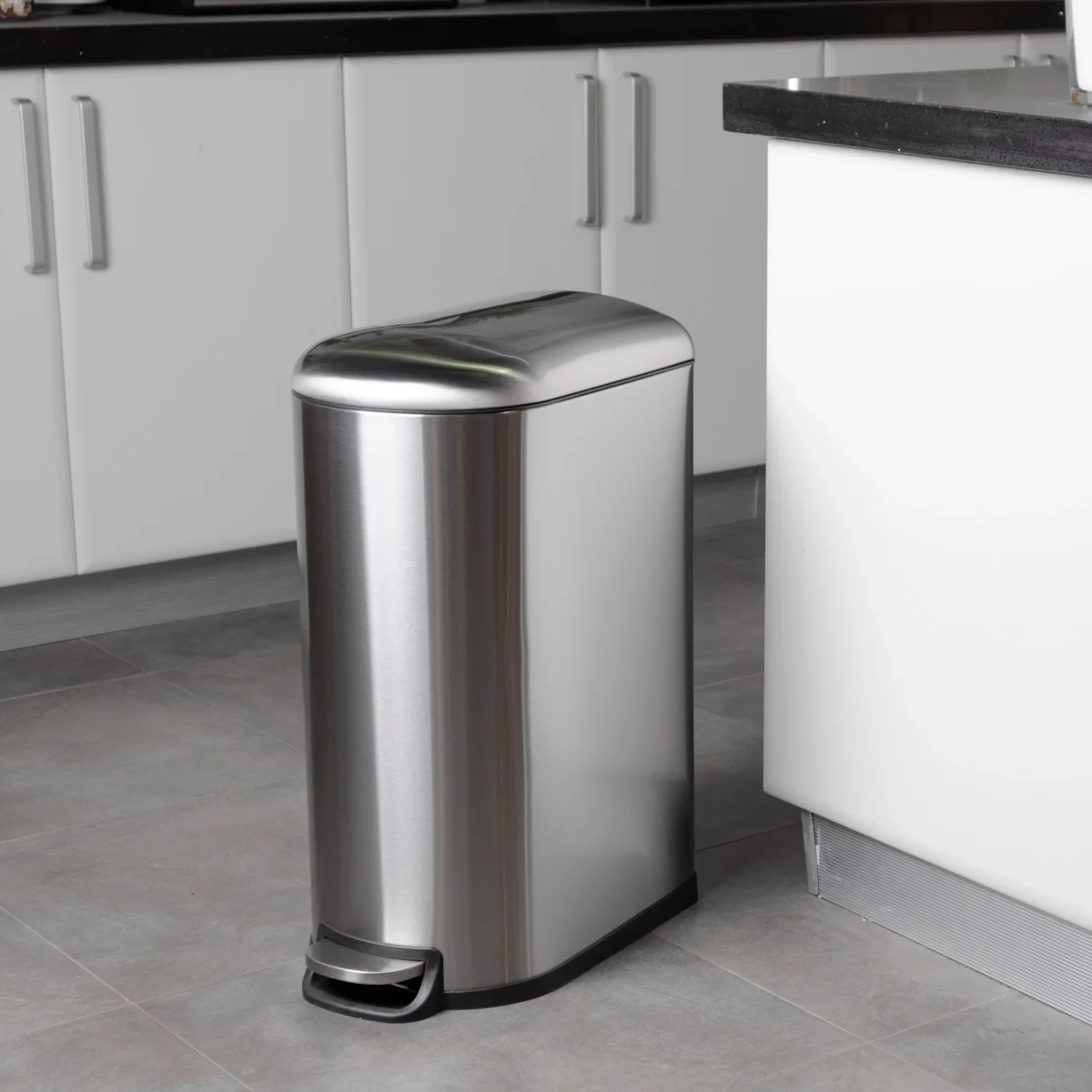 La poubelle à pédale 40L FULLER de Kitchen Move offre un design élégant et une conception ingénieuse gain de place. Son format étroit et rectangulaire (48 × 29 × 64 cm) s’intègre facilement dans les espaces réduits tout en offrant une capacité de 40 litres. Fabriquée en acier inoxydable brossé, elle combine robustesse et style moderne. Son mécanisme à pédale permet une ouverture fluide, sans contact manuel, pour une utilisation hygiénique et pratique. Le système de fermeture ralentie assure un mouvement silencieux et maîtrisé. La base antidérapante garantit une excellente stabilité, tandis que le seau intérieur amovible avec anse facilite le retrait du sac et le nettoyage. Compacte, stable et raffinée, la FULLER est la solution idéale pour les cuisines modernes, salles de bain ou bureaux.