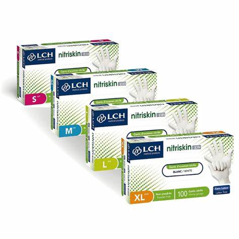 Gants d’examen Nitriskin Free en nitrile non poudrés blancLe Nitriskin possède les mêmes avantages, voire supérieurs, que le gant latex. Il possède un atout supplémentaire : il est sans latex ! Nitriskin est donc un gant idéal pour les personnes sensibles aux allergies provoquées par le latex et la poudre dans leur environnement quotidien. De plus, ce gant est une barrière de protection très efficace contre la perforation et une variété de produits chimiques. A noter que les gants d’examen sans poudre présentent une très bonne tolérance au contact des solutions hydro-alcooliques. Gant d’examen ambidextre en nitrile, non poudré, très souple, de surface rugueuse et très résistant. Avantages :- Excellente barrière de protection.- Gantage aisé.- Douceur et son confort tactile supérieur.- Résistance supérieure à l’abrasion et à la perforation.- Moins de sudation qu’avec le caoutchouc (latex).- Élasticité.- Insensible et peu réactif aux produits chimiques.- Robuste.- Absence d’allergies liées à la présence de latex ou poudre. Caractéristiques techniques :- Composition : nitrile – sans latex.- Caractéristique : jetable.- Couleur : blanc mat.- Conformité : Directive européenne 93/42/CEE- Classe I – Conformes à la réglementation pour le contact avec les denrées alimentaires (Commission Directive 90/128EEC ). Ne pas utiliser avec des conserves en milieux huileux, des graisses et huiles. – EN 420- EN 455-1/EN 455-2/EN 455-3 /EN 455-4 – EN 374-1/EN 374-2/EN 374-3 – ISO 10993-10 (non irritant et sensibilisant) – ISO 10993-11 – Conditions de conservation et stockage : 3 ans au sec à l’abri de la lumière, de la chaleur et de l’humidité- Taille de la manchette : 240 mm Guide des tailles : TailleDimensionsS (6/7)240 x 80 mmM (7/8)240 x 95 mmL (8/9)240 x 110 mmXL (9/10)240 x 115 mm Applications :- Personnes allergiques au latex et à la poudre.- Actes de soins courants, services d’urgences, infirmiers, médecins, dentistes…- Utilisation en laboratoires.- Industrie agroalimentaire et industries comme l’imprimerie, l’électronique…