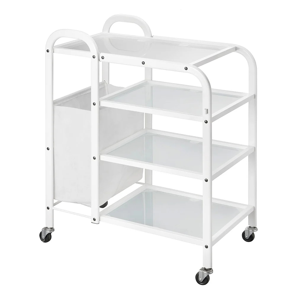 Ce guéridon possède 4 étagères spacieuses en verre trempé et 4 roulettes antidérapantes.