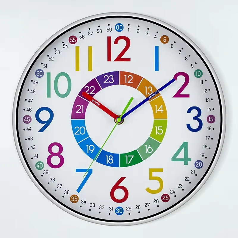 L’horloge Teaching Clock de 30 cm (12 pouces) est l’outil pédagogique ultime pour accompagner les enfants dans leur découverte du temps. Conçue avec un code couleur intuitif, elle permet de différencier instantanément les heures, les minutes et les secondes. Son cadran haute définition présente également les concepts de « Quarter Past », « Half Past » et « Quarter To », offrant une méthode complète pour lire l’heure aussi bien au format 12h que 24h.