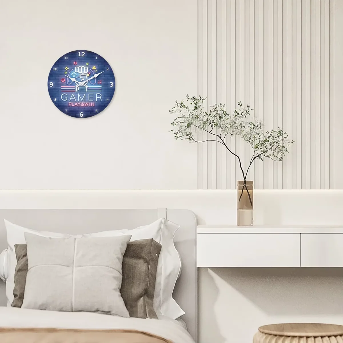 L’horloge Neon Game Console Pattern est l’accessoire indispensable pour tous les passionnés de jeux vidéo. Arborant un design dynamique sur un fond de briques bleues, elle met en scène une manette stylisée et le slogan motivant « GAMER PLAY & WIN ». Que ce soit pour décorer une salle de jeux, une chambre d’adolescent ou un bureau, cette horloge apporte une esthétique moderne et vibrante qui rappelle l’ambiance des salles d’arcade futuristes.