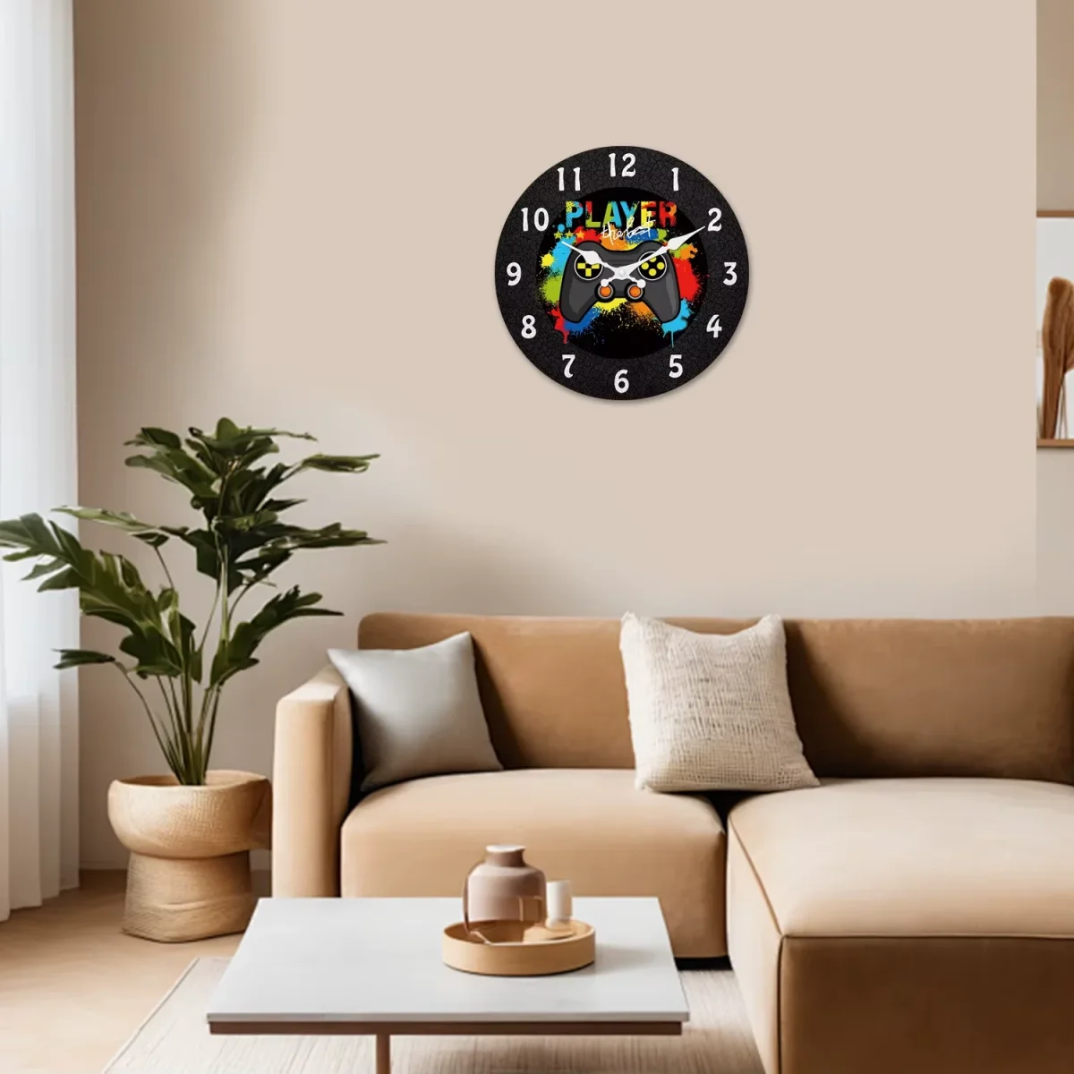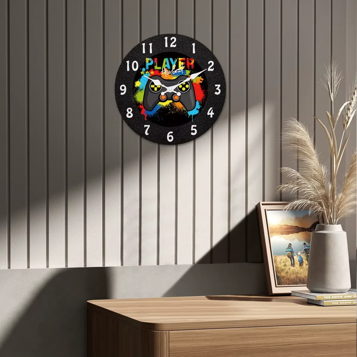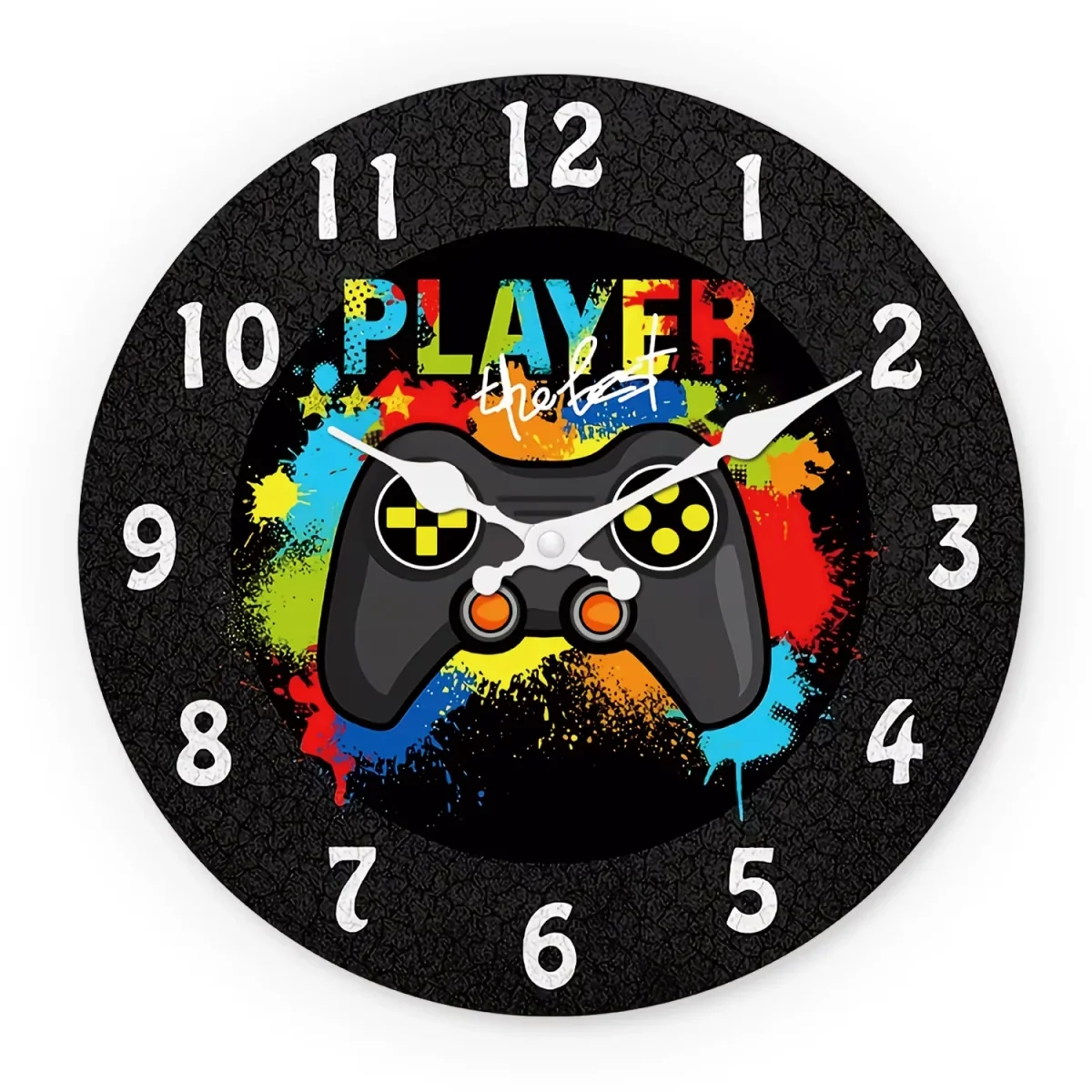 L’horloge Colorful Game Controller est l’accessoire ultime pour personnaliser votre setup. Arborant une illustration dynamique de manette sur un fond noir texturé avec des éclats de couleurs « splash », elle affiche fièrement le message « PLAYER THE BEST ». Que ce soit pour votre salon, votre chambre ou votre salle de jeux, cette horloge en bois apporte une touche de style moderne et passionnée à votre décoration intérieure.