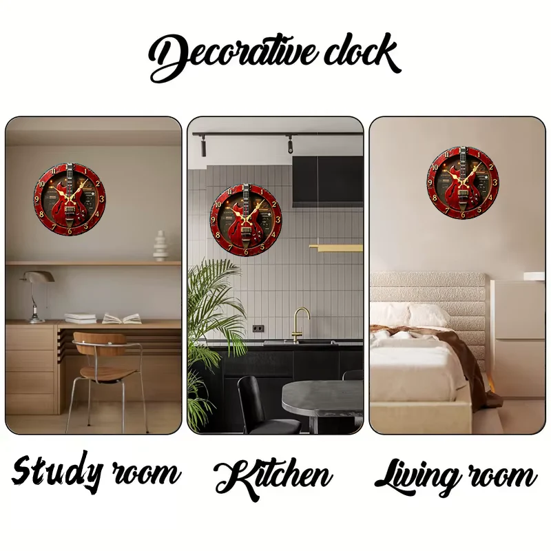 L’horloge Vintage Guitar Wooden Clock est une véritable ode à l’âge d’or du rock et du blues. Son cadran de 25 cm (10 pouces) arbore une illustration détaillée d’une guitare électrique vintage sur un fond d’amplificateurs rétro, créant une atmosphère « Music Studio » authentique dans votre salon, votre bureau ou votre chambre. Son design circulaire en bois apporte une texture naturelle et une élégance intemporelle à votre décoration murale.