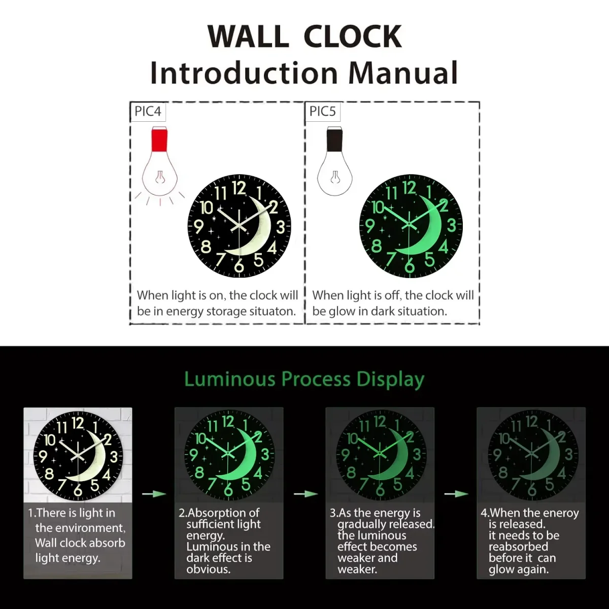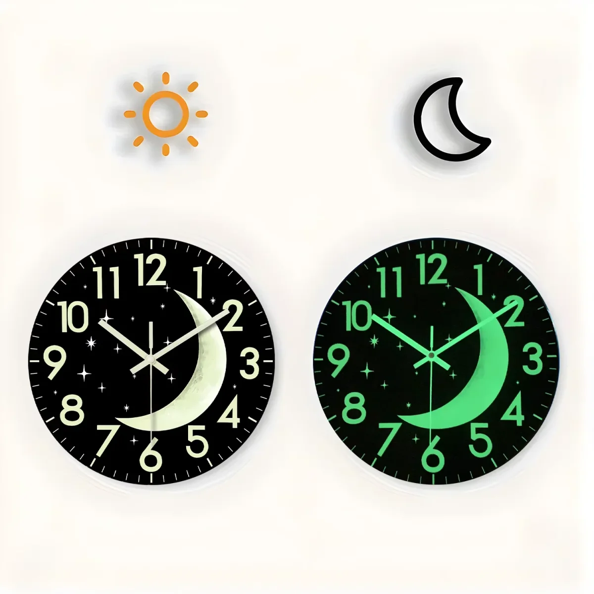 Grâce à son revêtement phosphorescent haute performance, les chiffres et les motifs célestes absorbent la lumière naturelle ou artificielle durant la journée pour briller doucement dans l’obscurité. C’est la solution idéale pour consulter l’heure sans avoir à allumer une lumière agressive, rendant cette horloge parfaite pour une chambre d’enfant ou une chambre parentale.