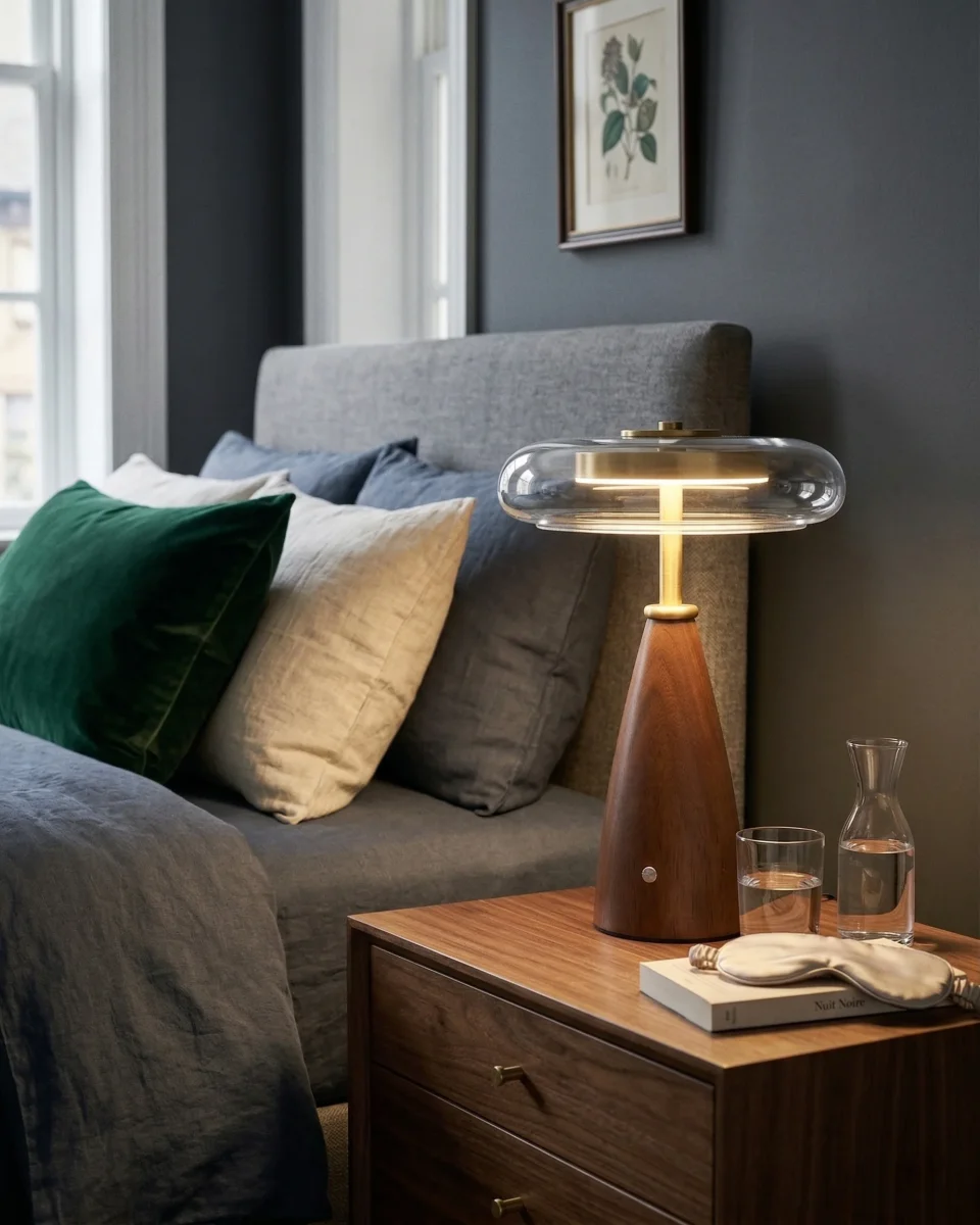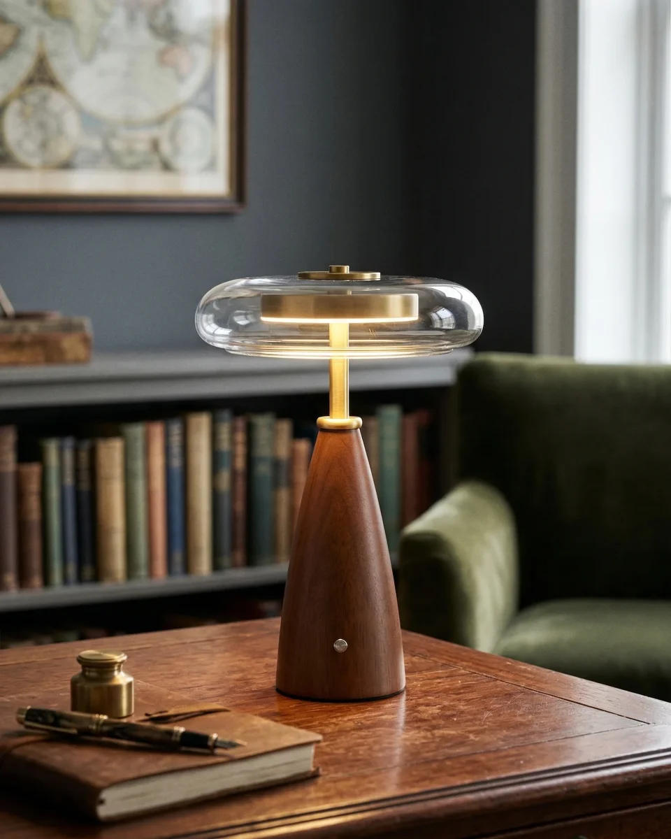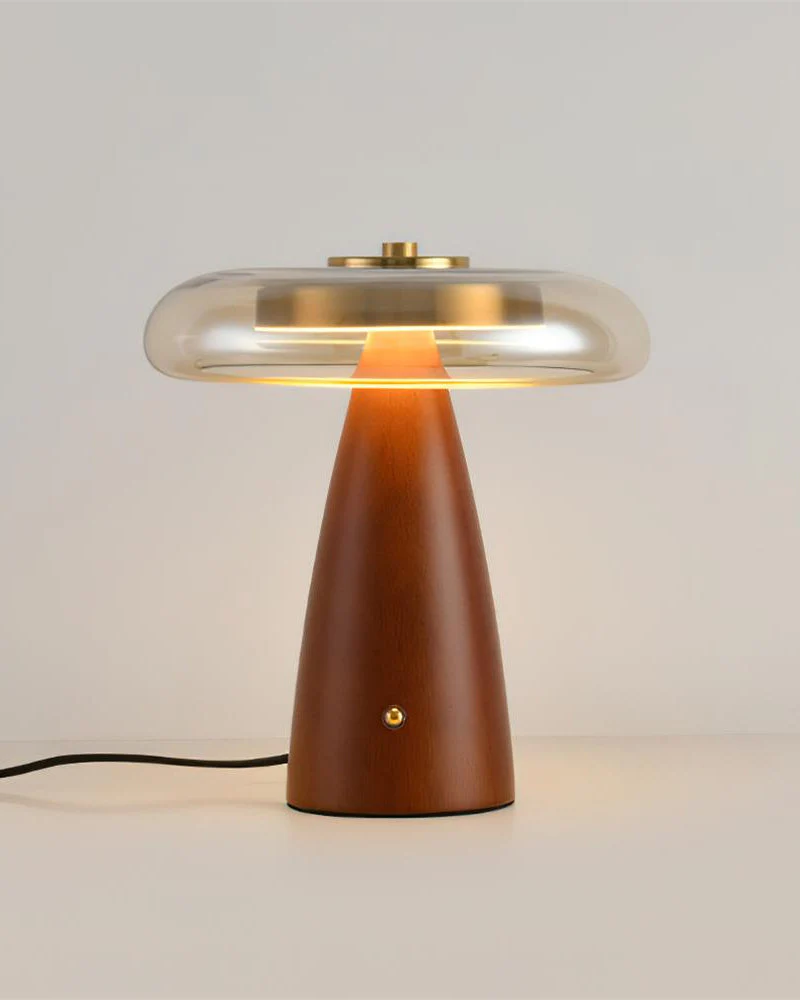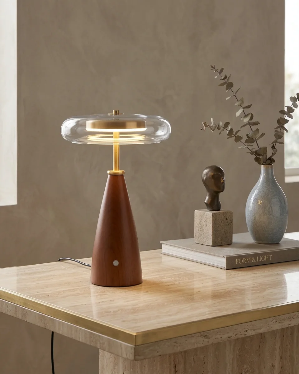 Lampe de Table NALU : L’Équilibre Sculptural entre Noyer Noble et Verre Cognac