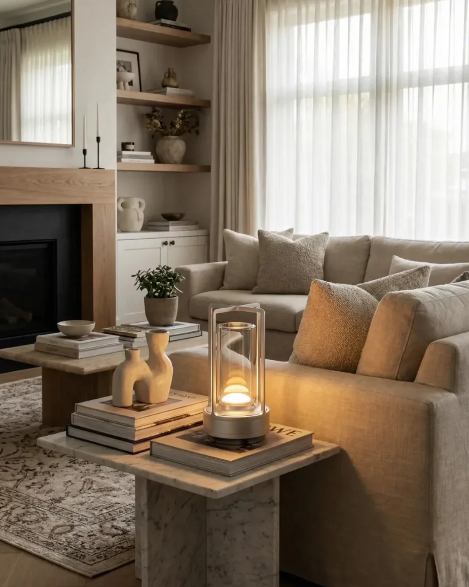 Compacte et stable grâce à sa base antidérapante, cette lampe de table rechargeable se déplace facilement. Elle est parfaite du salon à la chambre ou à une terrasse abritée. La lampe sans fil conserve toujours un rendu premium. Elle est un excellent choix pour l’esthétique et la praticité, sans aucun câble apparent.