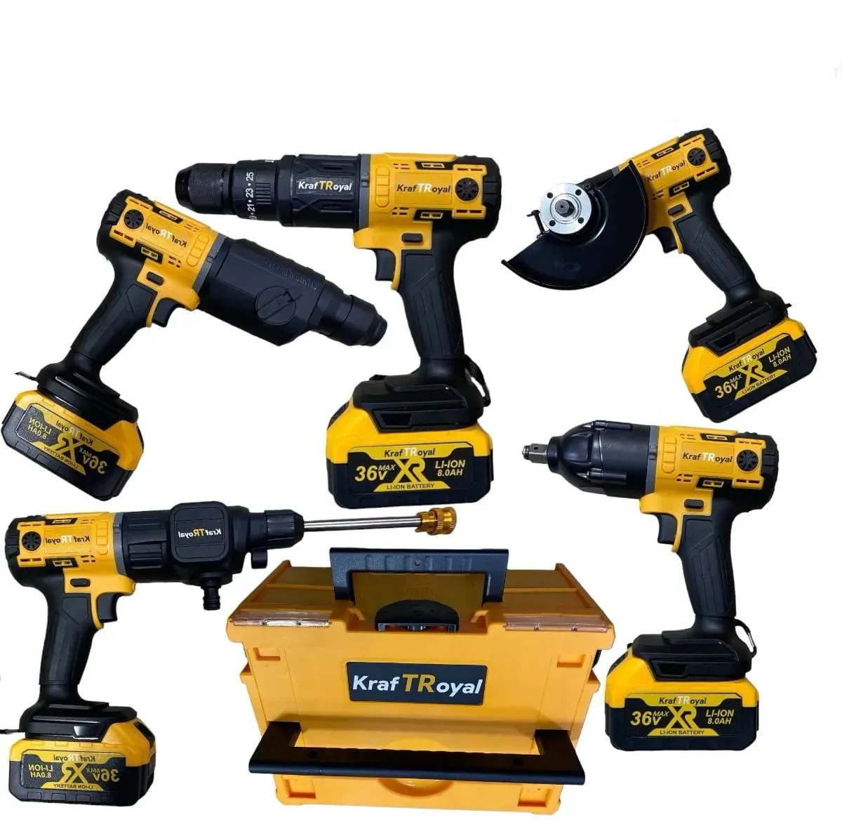 Outil sans fil universel 5 en 1 KraftRoyal 36V, 5 têtes, Boulonneuse, Visseuse, Jet d’eau, Perforateur et Meuleuse d’angle