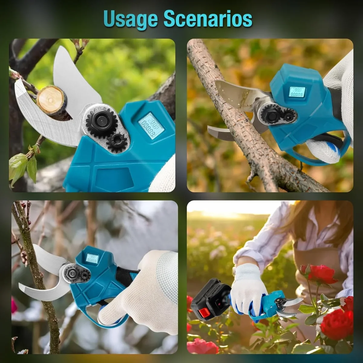 - 【3 réglages de la largeur】 Notre élagueuse, le sécateur électrique à batterie coupe dispose de 3 réglages de largeur. Les sécateurs électriques à batterie pour le jardinage ont un large éventail d’applications. Vous pouvez utiliser le sécateur électrique pour tailler les branches irrégulières dans le jardin, les longues branches fleuries ou les arbres fruitiers