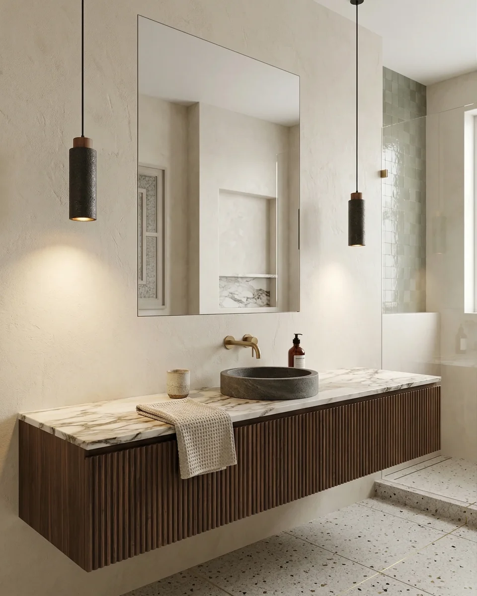 L’exigence d’ODANI s’exprime dans la fusion parfaite entre style et technicité. La suspension ERIA est rigoureusement certifiée pour les zones humides, s’imposant comme le choix prioritaire pour sublimer une salle de bain de prestige ou un spa privé. Résistante à la vapeur, elle diffuse une lumière douce (3000K Blanc Chaud) orientée vers le bas, soulignant les textures naturelles du travertin et créant une ambiance de sérénité absolue.