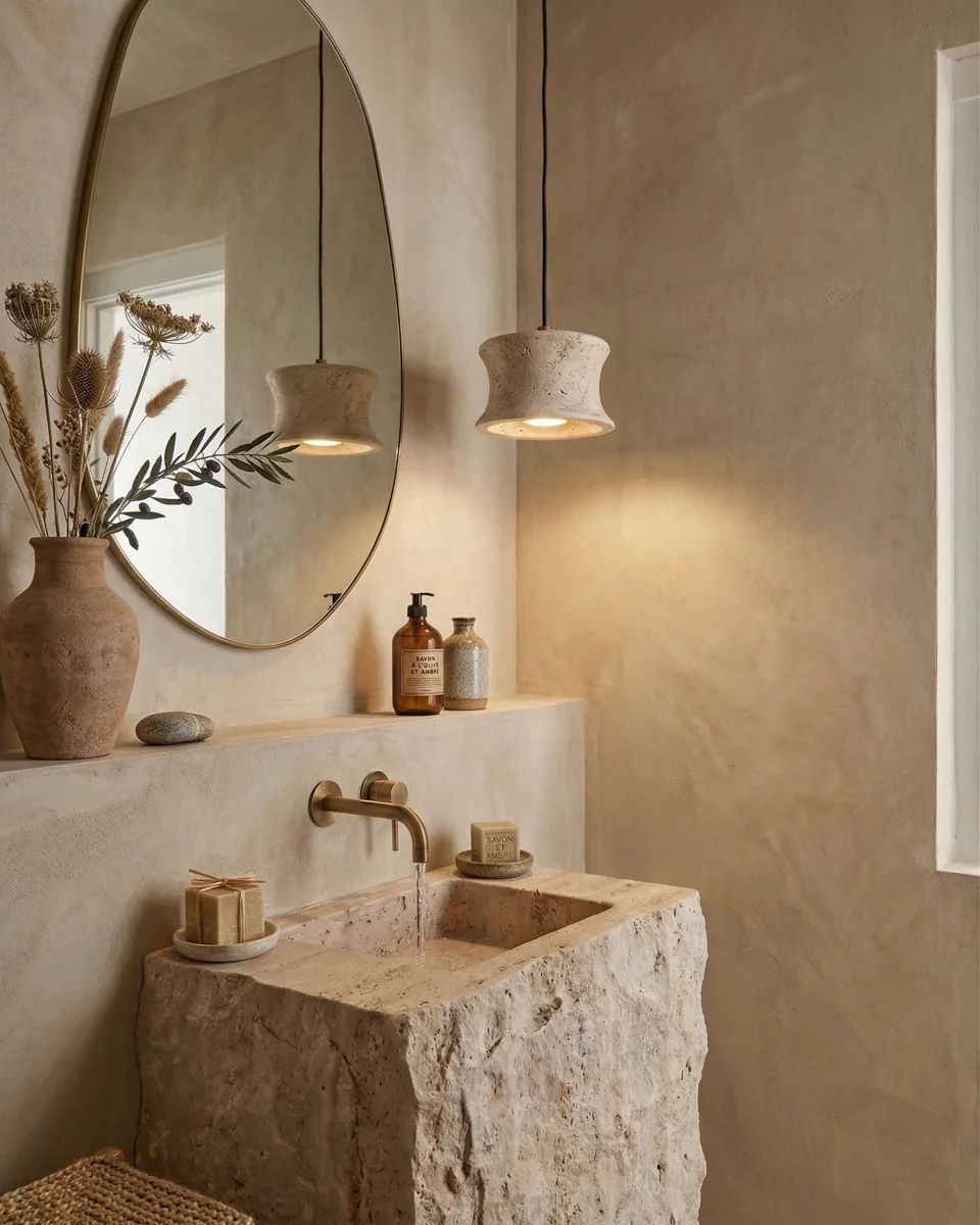 - Travertin Beige Véritable : Pierre millénaire sélectionnée pour son authenticité et son grain tactile.