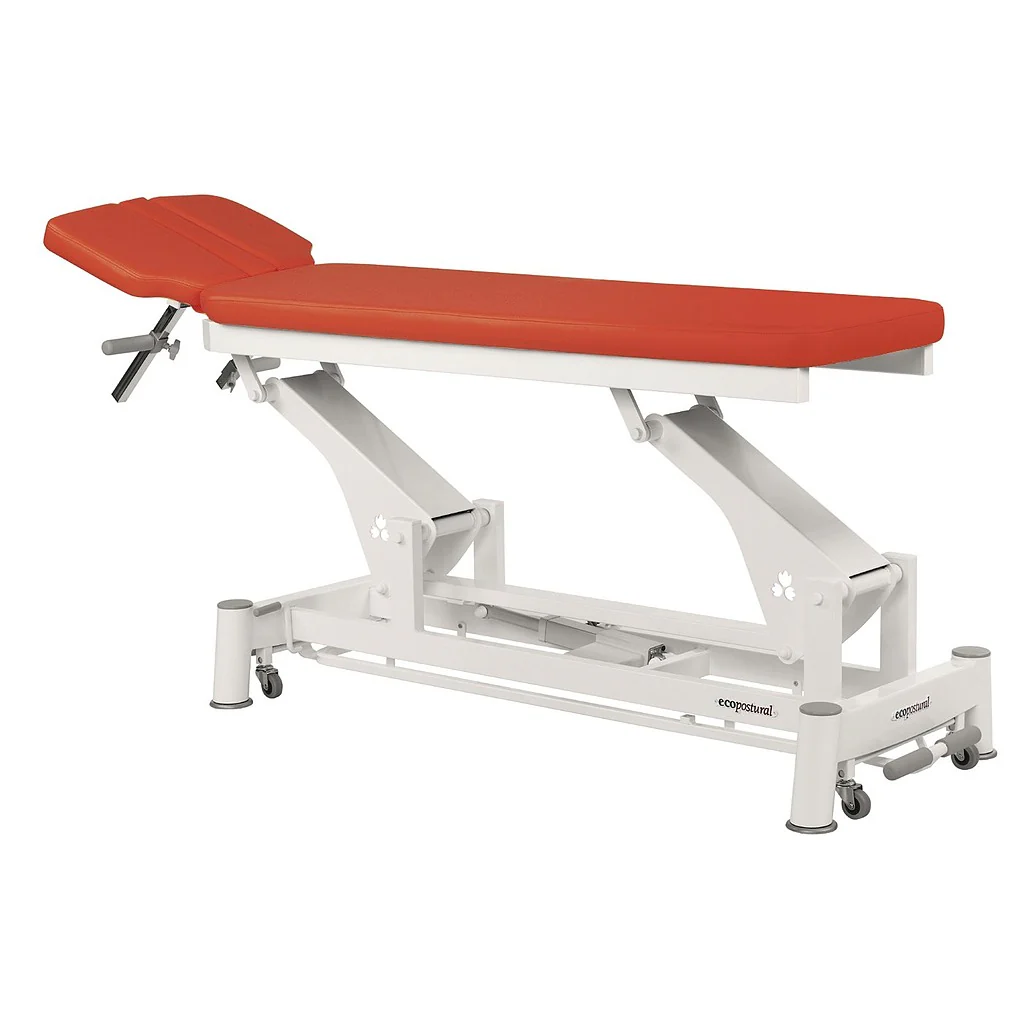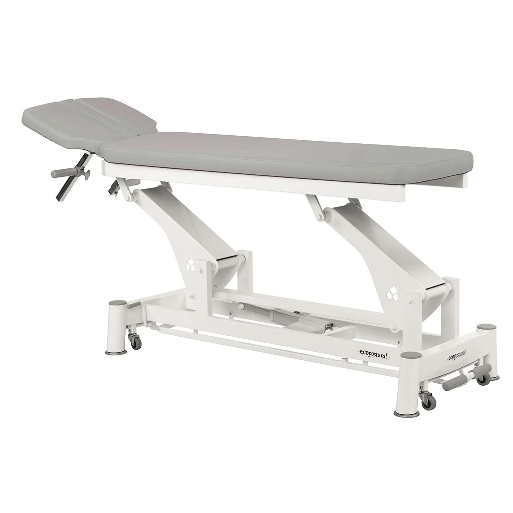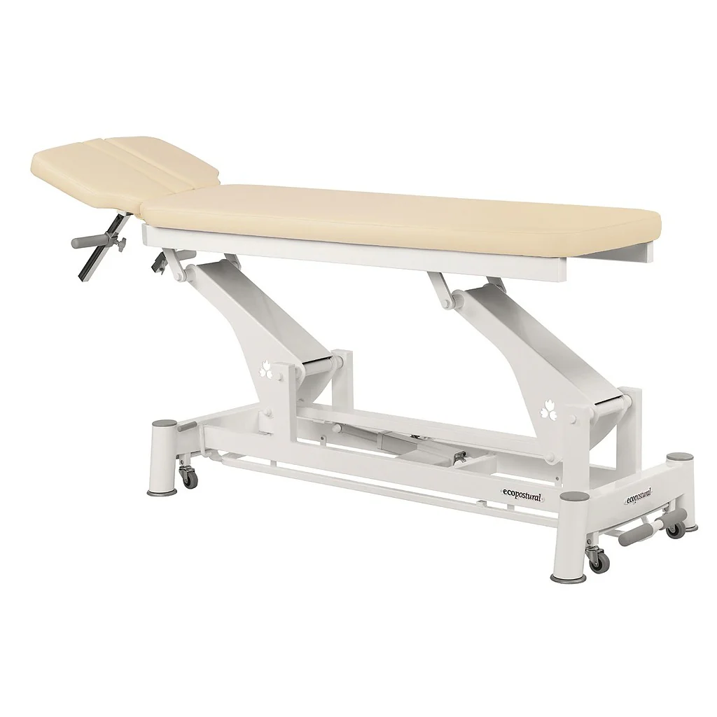 Sa tétière est ajustable en proclive, et la table peut s’ajuster en hauteur grâce à une commande au pied, placée sur le cadre de la table. Il est possible de l’élever jusqu’à 91 cm de hauteur, avec un déport lateral d’une vingtaine de centimètres seulement.