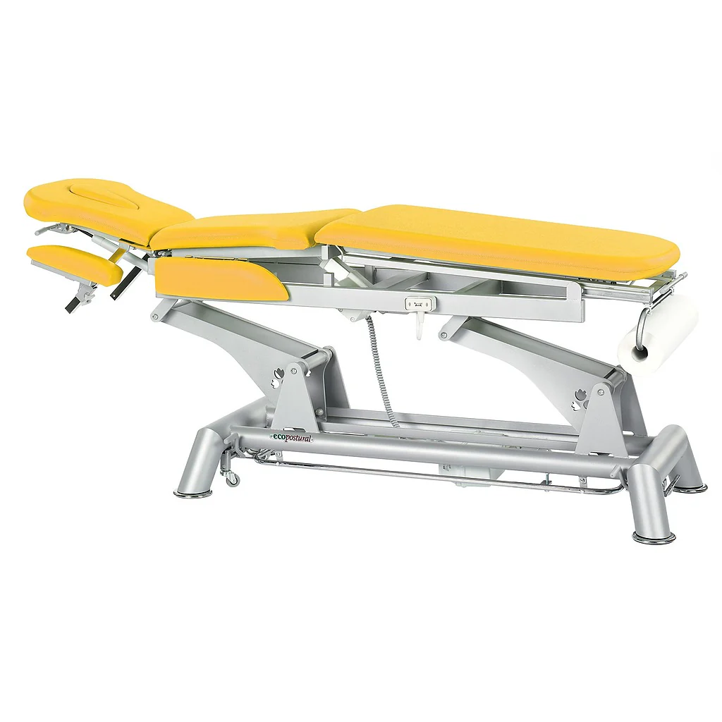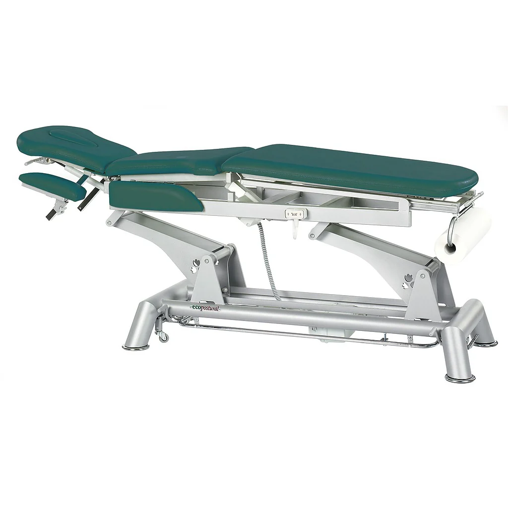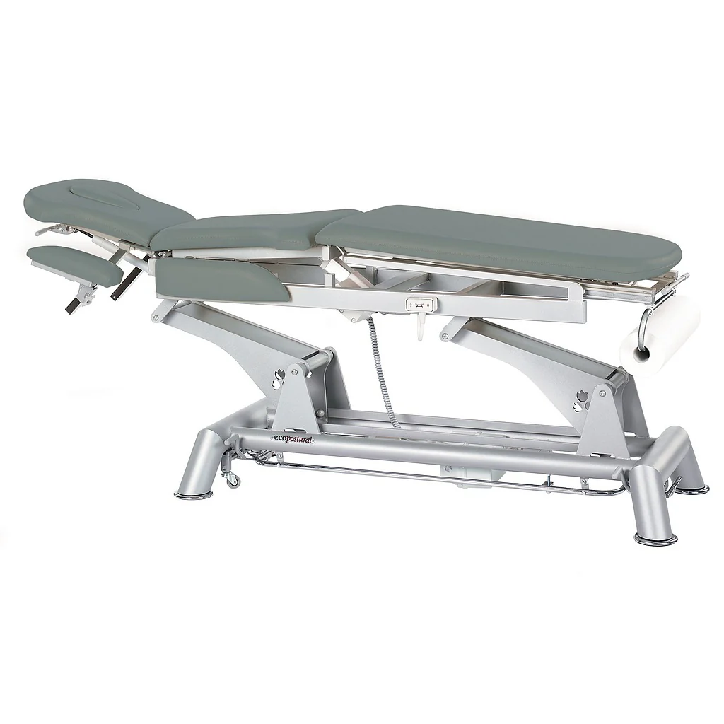 Table avec système d’élévation électrique. Structure acier avec peinture en poudre époxy gris. Sellerie simili-cuir, ignifuge M2. Cyphose électrique 26°. Avec ouverture faciale (bouchon visage) de série. Porte rouleau chromé inclus.