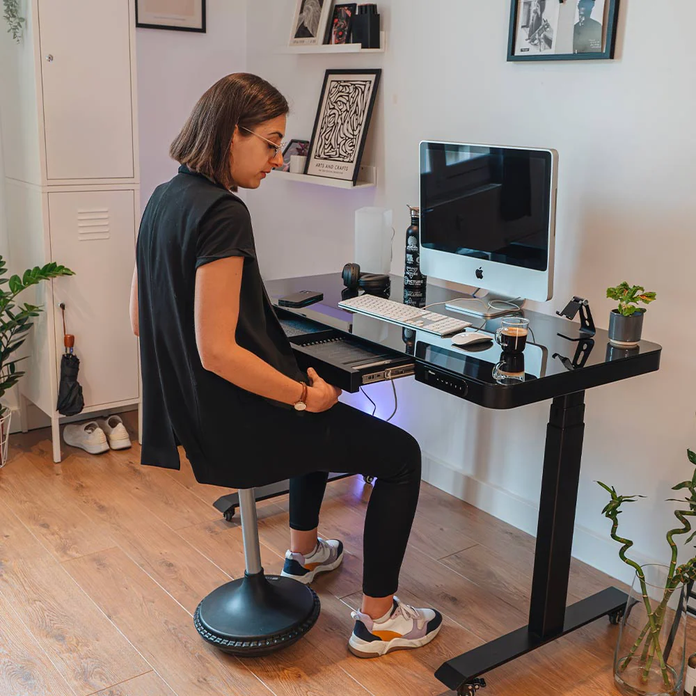 Adoptez une posture active et stimulez votre corps tout au long de la journée. Le Wooble favorise un bon alignement de la colonne vertébrale et renforce les muscles dorsaux grâce à son assise mobile et sa base arrondie. Réglable en hauteur, stable et rotatif à 360°, ce tabouret ergonomique vous accompagne dans chaque mouvement. Compact et moderne, il complète idéalement un bureau assis-debout sans encombrer l’espace.