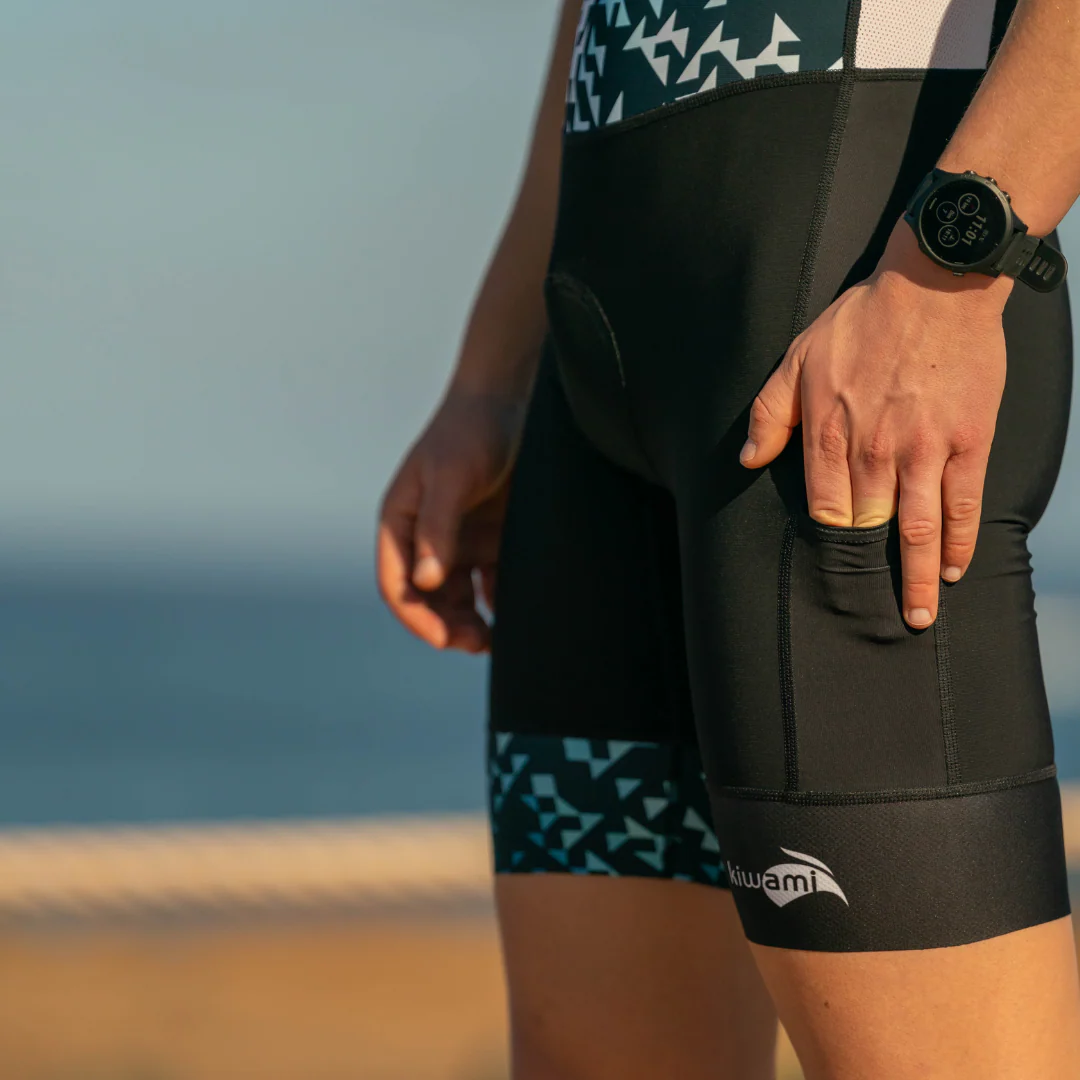 - 3 Ergo pockets : 1 grande poche dorsale plaquée et 2 poches ergonomiques sur les cuisses pour un ravitaillement éclair lors de la partie vélo;