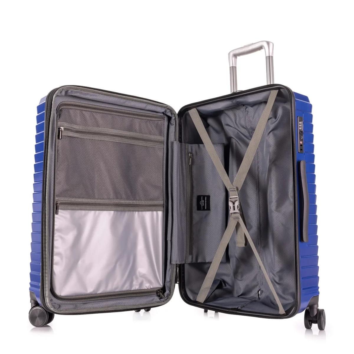 Voici notre Dream24 en bleu. Légère, pratique et solide voici une valise cabine idéale pour vos déplacements. Ses quatre double roues ultra-silencieuses apportent un réel confort. Ses fermetures éclair se bloquent dans une serrure à combinaison. Une fermeture TSA vous permettra de voyager aux USA en toute tranquillité même si vous devez enregistrer votre valise. Son intérieur est fonctionnel avec d’un coté un rabat qui ferme par un zip et deux grandes poches : l’une filet et l ‘autre plastifiée et de l ‘autre une sangle réglable et une poche zippée. Belle, stylée et super pratique , elle est prête à vous accompagner au bout du monde.